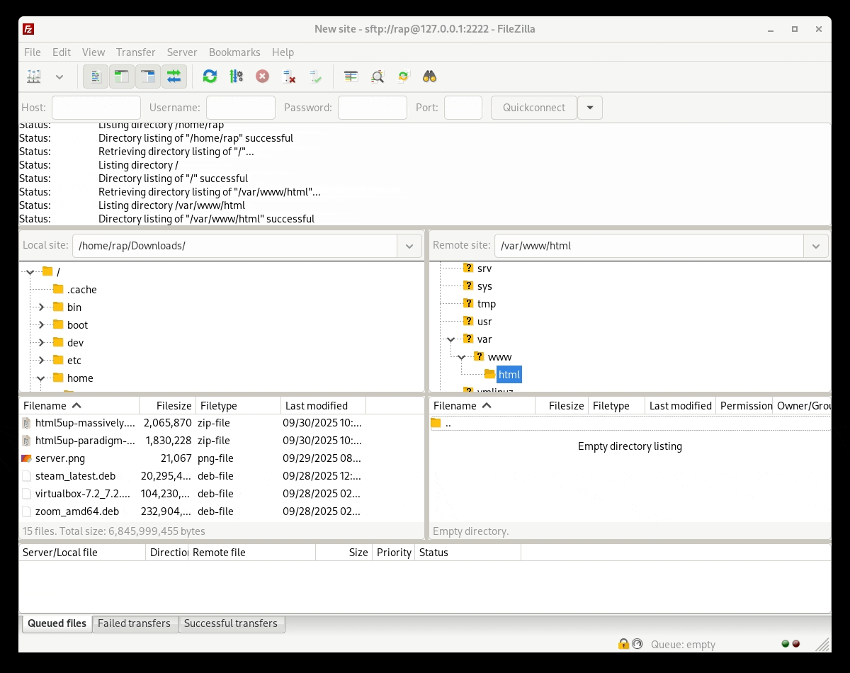 scp -P 2222 ~/Downloads/html5up-paradigm-shift.zip rap@127.0.0.1:/var/www/html - The command for uploading files via SCP when using Bridge Network Adapter is: