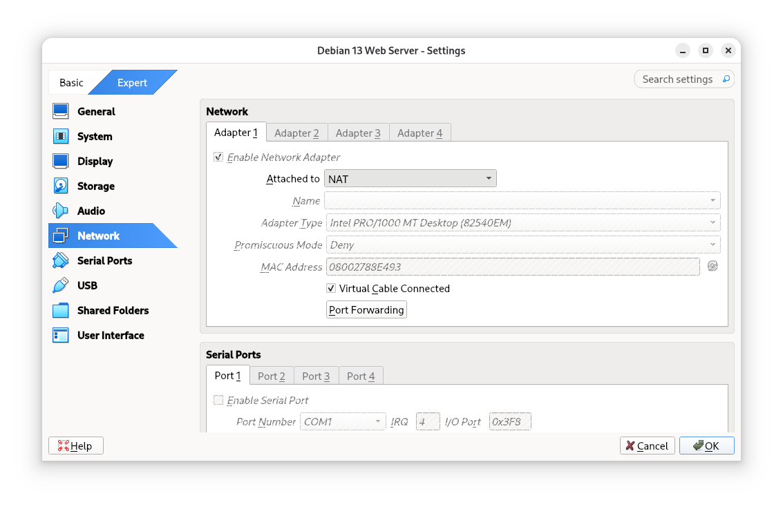 For this project, we will use either NAT with Port Forwarding or Bridge Adapter. The easiest of the two options is Bridge Adapter because all we need to do is change the Attached to Setting to “Bridge”. This will allow our VM to get an IP address from your Home Router and it will be just another computer in your network. However, for some people, this is not possible because their network interface card does not allow them to use Bridge mode. Some routers also may reject a Bridged Network adapter. For example, in the College Network, we cannot use Bridge Network Adapter because the router rejects the connection. So the first thing we need to do is figure out if we can use Bridge Network Adapter.