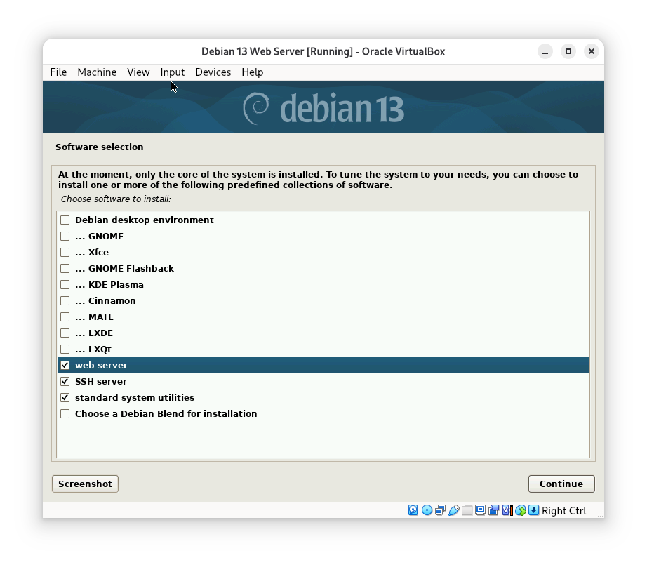 - Follow the steps in this presentation as a general guide. Please do not install a desktop environment as we wont need one. When you get to this step, pick: Web Server, SSH Server, and Standard System Utilities