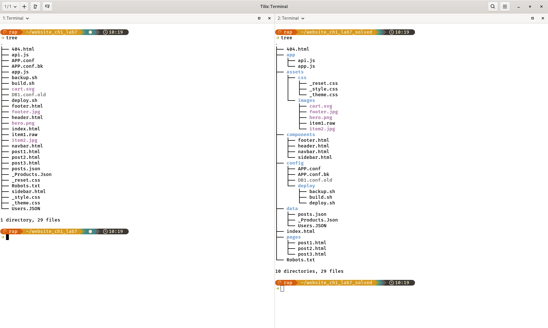 curl https://cis106.com/assets/scripts/chq-lab7.sh | bash - Once you finish organizing the files, the directory must look like the terminal on the right. The terminal on the left shows you the starting point. The terminal on the right shows you the final result. Use the output of the terminal on the right to understand where you must place each file.